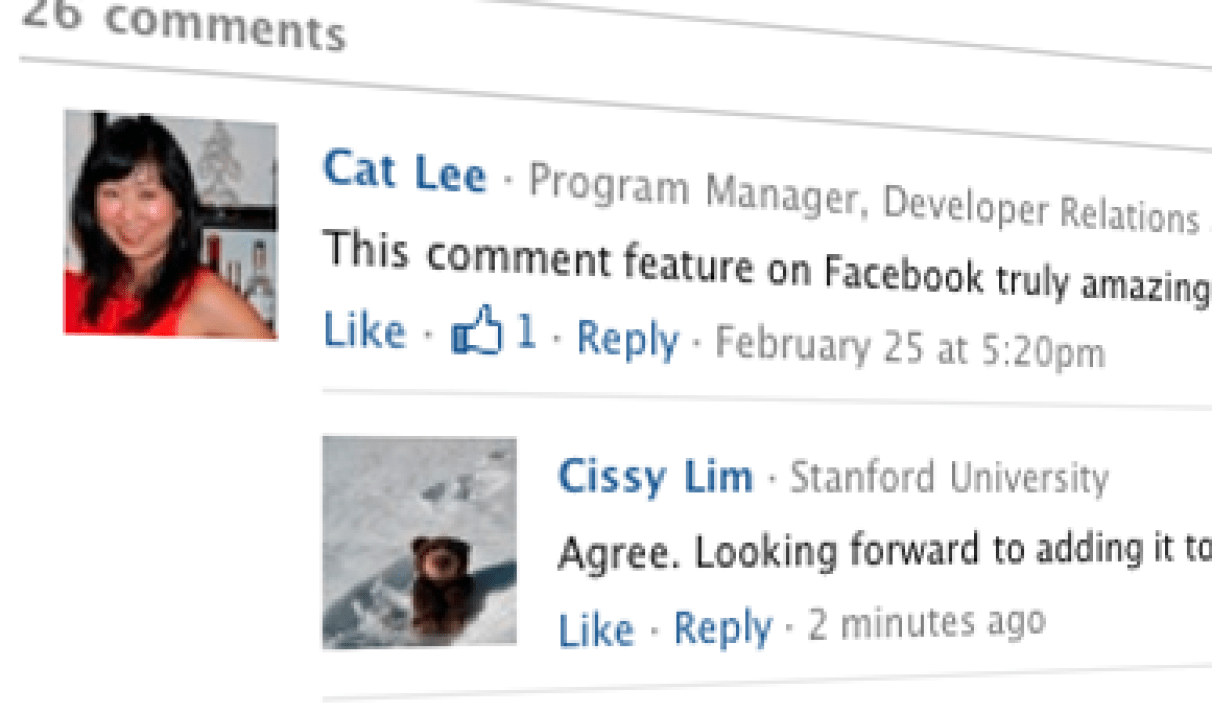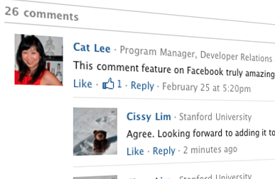 Facebook a annoncé aujourd’hui une mise à jour de sa plateforme de commentaires mise à la disposition des éditeurs de sites Internet, qui présente l’avantage d’atténuer la frontière entre le premier réseau social du monde et les blogs ou sites de presse où se nouent également des discussions. Par défaut, les messages publiés via cette API par les membres inscrits sur Facebook sont également reproduits sur la page de l’utilisateur, ce qui permet d’engager davantage d’internautes dans les conversations, et de rendre visibles celles qui ne l’étaient auparavant qu’aux visiteurs du blog commenté. C’est le prolongement logique des fonctions « J’aime » et « Partager » de Facebook.