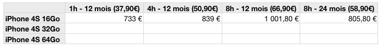 Enfin, si l’offre qui coûte le moins cher aux clients la première année est celle de Sosh, à l’inverse celle qui est la plus coûteuse est celle d’Orange lorsque l’on souhaite acheter un iPhone 4S 64Go en ne s’engageant que sur 12 mois.