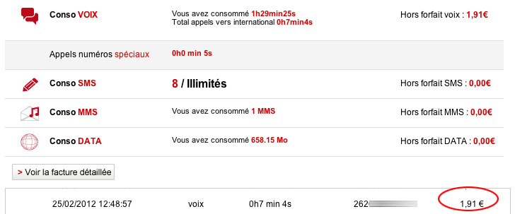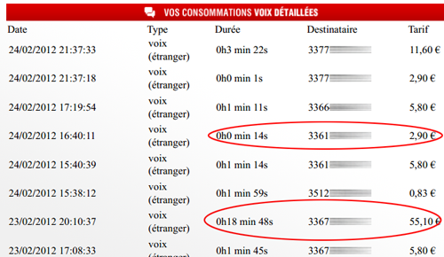 En effet, sur sa grille tarifaire (.pdf), Free indique que les communications vocales émises depuis le Portugal vers la France sont facturées 42 centimes la minute. Mais sur son encours de facturation, notre freenaute se rend compte que c’est presque le septuple qui lui est facturé ! Free semble en effet retenir le tarif de 2,90 euros la minute entamée, ce qui correspond non pas au tarif « Portugal vers France » mais « Portugal vers le reste du monde ».