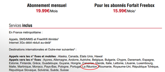 Autre facture, autre situation. Maxime Baumard nous a envoyé la copie d’une facture sur laquelle apparaît l’appel qu’il a passé depuis la France avec son mobile Free, vers une ligne fixe dans sa famille à la Réunion. L’appel de 7 minutes lui est facturé 1,91 euros hors-forfait. Or étant titulaire d’un abonnement Free Mobile à 19,99 euros, Maxime devrait bénéficier des appels illimités vers la Réunion.