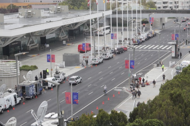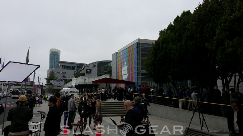 18h30 : La presse se masse à l'entrée du Moscone Center pour assister à la conférence.