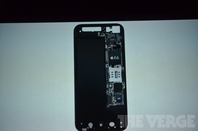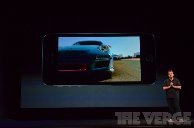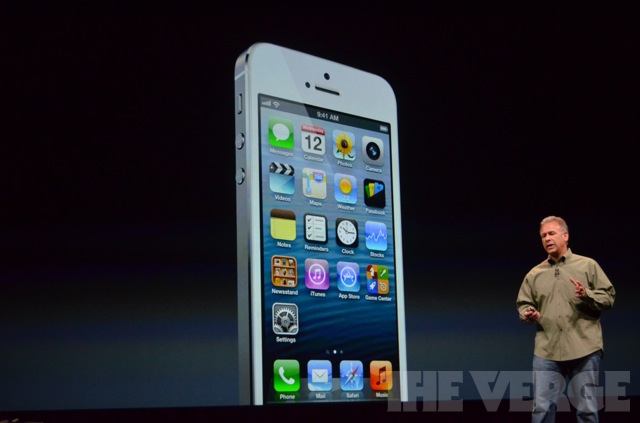 19h15 : Il est composé de verre et d'aluminium. 18% plus fin que l'iPhone 4S. 20% plus léger (112 grammes). Ecran 4 pouces (on voit 5 icones verticales, comme les rumeurs le prétendaient). Résolution : 1136 x 640. Mais Apple a voulu qu'il tienne dans la main.