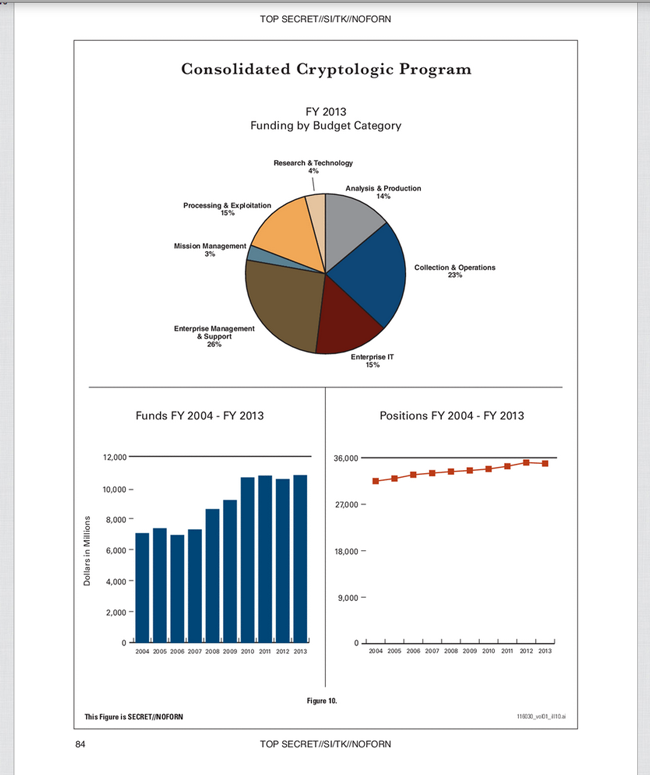En plein scandale sur le programme PRISM, le budget noir révèle qu'une part importante des dépenses, 11 milliards de dollars, est consacrée "programme cryptologique consolidé", dans lequel figurent les dépenses en déchiffrement réalisées au sein de la NSA et des différentes composantes de l'armée (Air Force, Army, Navy et Marines).