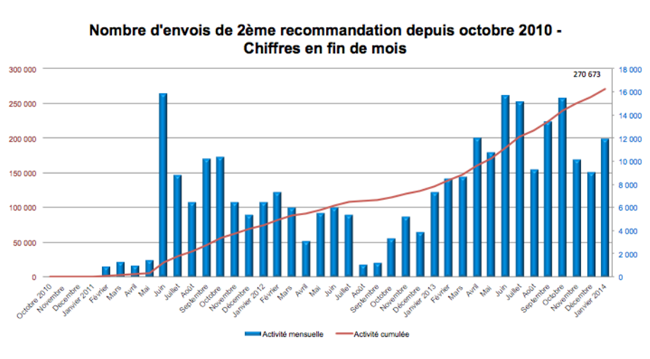 Ainsi en janvier, 132 000 abonnés à internet ont reçu un courriel d'avertissement sur la boîte de leur fournisseur d'accès. C'est 60 % de plus qu'un an auparavant. Même chose (+ 62 %) pour les courriers avec accusé de réception envoyés par la poste aux abonnés récidivistes, avec 7 350 lettres envoyées par l'Hadopi le mois dernier.