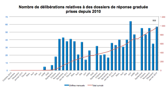 La Haute Autorité pour la Diffusion des Oeuvres et la protection des droits sur Internet (Hadopi) a publié les chiffres des avertissements adressés au mois de janvier 2014 (.pdf) aux internautes dont l'accès à internet a été utilisé pour pirater des oeuvres sur les réseaux P2P. Ils s'inscrivent dans la tendance à la très forte hausse ressentie sur la fin de l'année 2013.