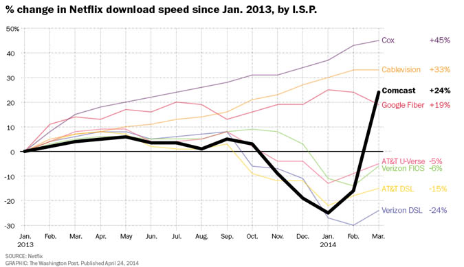 Le graphique réalisé par le Washington Post à partir des données de Netflix montre l'évolution de la vitesse de téléchargement sur la plateforme chez les principaux opérateurs de télécommunications américains, avec un focus sur Comcast. On constate ainsi une érosion progressive entre septembre 2013 et janvier 2014 avant une amélioration très rapide au cours des deux mois suivants.