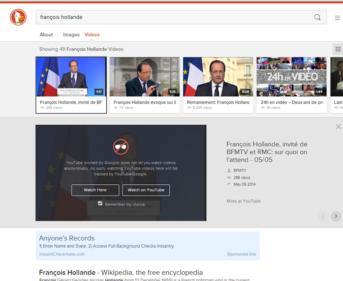 Auparavant, il fallait par exemple ajouter "!image" ou "!video" dans la requête, et l'internaute était redirigé vers les moteurs de recherche internes de Google Images ou YouTube. Désormais, les résultats sont intégrés directement à l'interface de recherche, et il est même possible de regarder les vidéos (qui semblent encore toutes tirées exclusivement de YouTube) sans quitter DuckDuckGo :
