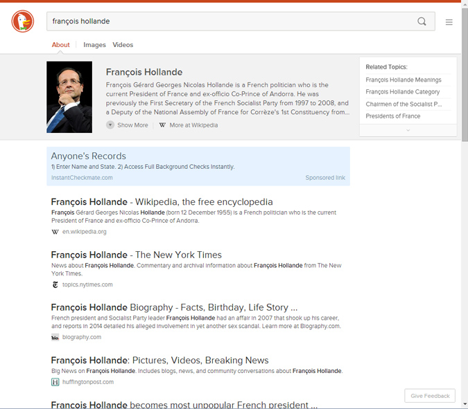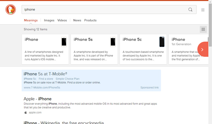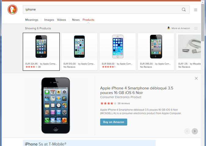 Selon les recherches effectuées, DuckDuckGo n'affichera pas les mêmes onglets. Par exemple, si l'internaute cherche "iPhone", le moteur lui proposera de préciser la recherche entre les différentes versions du smartphone d'Apple, et proposera en plus des liens vers des actualités liées à l'iPhone (le fait qu'il n'y ait pas cet onglet pour "François Hollande" montre que l'algorithme est encore perfectible), et des liens "shopping" qui permettent de commander le produit chez Amazon — en attendant l'intégration probable d'autres partenaires commerciaux :