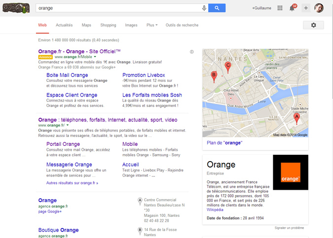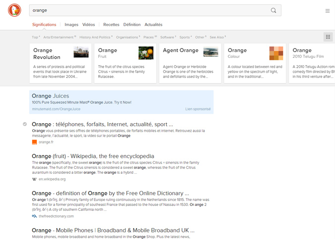 Comparons également une recherche sur le mot "Orange", qui peut désigner aussi bien l'opérateur télécom français que le fruit, ou la couleur. De son côté, Google ne connaît que la marque de téléphonie :