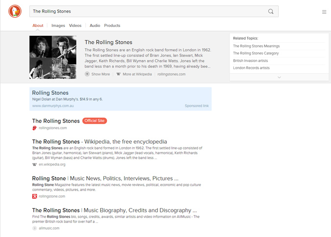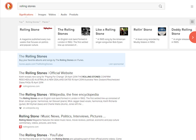 Son principal atout réside dans la contextualisation des onglets, qui changent en fonction des mots clés saisis, avec la possibilité de préciser le sens de la recherche. Par exemple, une recherche de "Rolling Stones" va proposer des vidéos (tirées de YouTube) ou des musiques (de Soundcloud) du légendaire groupe de rock, mais il est aussi possible de préciser d'un clic que l'on s'intéressait en réalité au magazine "Rolling Stone", ou à la chanson "Like a Rolling Stone" de Bob Dylan :