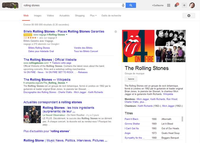 Puis, si l'on confirme d'un clic que l'on recherche bien les Rolling Stones en tant que groupe musical :
