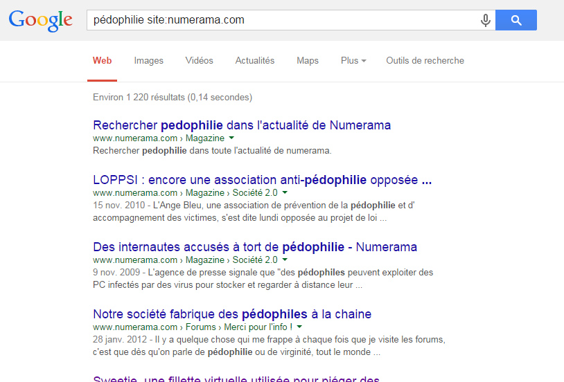 Nous n'avons pas réussi à avoir plus d'explications sur la nature du bug qui semblait s'abattre spécifiquement sur Numerama, mais Google nous a contacté ce mercredi, gêné, pour nous informer de la réparation du problème qui faisait que tous nos articles sur les effets de bord indésirables du blocage administratif des sites pédophiles étaient censurés dans les résultats des recherches.