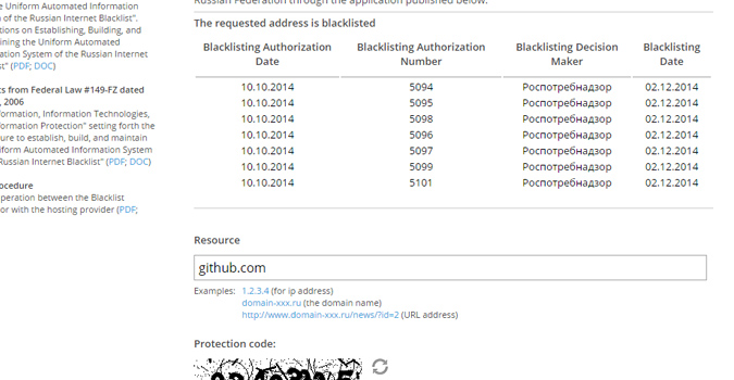 Ainsi le blocage de Github est clairement identifié avec une traçabilité des autorisations de blocage et des mises en place effectives. Le site précise que les inscriptions dans le registre des sites à bloquer peuvent alors faire l'objet de recours dans les 3 mois qui suivent, ce qui n'est pas prévu en France (sauf à réussir à avoir connaissance officiellement de l'ordre de blocage qui n'est pas publié et dont seuls les FAI et hébergeurs ont connaissance).