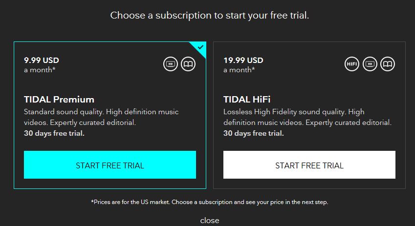 À la différence des autres services de musique à la demande qui fournissent en général un accès gratuit à condition d'accepter d'écouter périodiquement des annonces publicitaires pendant l'écoute, Tidal ne mise que sur le payant. La seule entorse à cette règle est l'existence d'une période d'essai de 30 jours qui est proposée pour tester l'outil avant de s'engager.