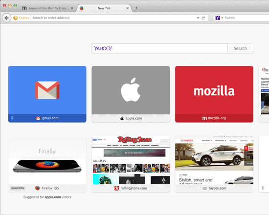 A chaque ouverture d'un nouvel onglet, Firefox affichera des raccourcis (sous forme de "tuiles"), non seulement vers ses sites préférés, mais aussi vers des sites d'annonceurs. Les publicités seront choisies en fonction de l'historique de navigation de l'internaute. Par exemple ci-dessous, la publicité pour un téléphone sous FirefoxOS est affichée parce que l'internaute a pour habitude de visiter le site officiel d'Apple :