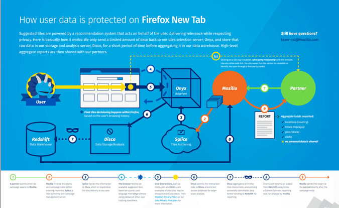 Pour savoir quelles publicités afficher chez quels internautes, Mozilla envoie au navigateur (par un serveur baptisé Onyx) une liste de catégories de tuiles suggérées disponibles en fonction du pays et de la langue de l'utilisateur, avec au moins cinq URL par catégories. C'est ensuite le navigateur qui décide d'afficher ou non la publicité si l'historique correspond aux critères déterminés avec l'annonceur. Le fait d'imposer au moins 5 URL évite que les données renvoyées au serveur publicitaire de Mozilla permettent de déduire trop facilement l'historique de l'internaute, en testant URL par URL.
