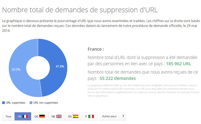 L'autorité administrative annonce au passage qu'elle a été "saisie de plusieurs centaines de demandes de particuliers s’étant vu refuser le déréférencement de liens Internet (ou adresses URL) par Google". Selon le Rapport de transparence de Google, Google a reçu en France à ce jour 55 222 demandes concernant la suppression de 185 962 URL. Une majorité d'entre elles n'ont pas été satisfaites par Google, à qui la CJUE a demandé de concilier vie privée et droit à l'information.