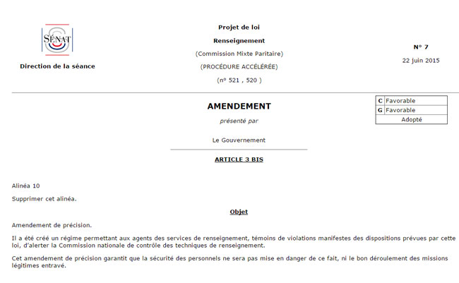 Présenté comme un "amendement de précision", c'est-à-dire comme une modification qui ne change rien à la substance du texte, l'amendement n°7 du gouvernement présenté mardi supprime toutefois l'alinéa qui devait permettre aux whistleblowers de l'Etat de transmettre à la CNCTR des "éléments ou informations protégés au titre du secret de la défense nationale", ou qui sont "susceptibles de porter atteinte à la sécurité des personnels ou des missions". Il s'agissait d'une disposition ajoutée en guise de bonne foi par la commission mixte paritaire, mais dont le Gouvernement n'a pas voulu même si la CNCTR est elle-même astreinte au respect du secret-défense.