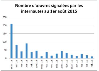 Au 1er août 2015, 772 œuvres ont fait l'objet d'un ou plusieurs signalements. Dans le détail, 200 d'entre elles (26 %) étaient en fait disponibles sur au moins un site légal (l'internaute n'avait alors pas bien cherché), tandis que 152 autres (20 %) étaient effectivement indisponibles, après confirmation des ayants droit. La majorité (420 signalements, 54 %) était encore en cours de consultation.