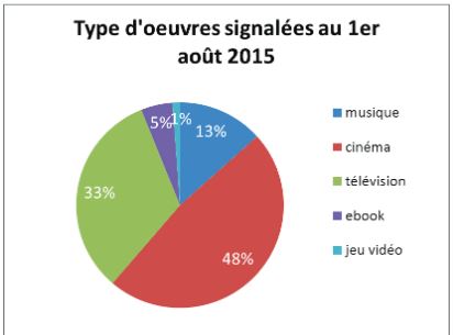 Des cinq univers (cinéma, télévision, jeu vidéo, musique, livre électronique) dans lesquels il est possible de faire un signalement, c'est celui du septième art qui est le plus prisé : il concentre presque la moitié (48 %) des demandes. La télévision est le deuxième gros morceau (33 %). Les autres secteurs se partagent les restes : 13 % pour la musique, 5 % pour les e-books et 1 % pour le jeu vidéo.
