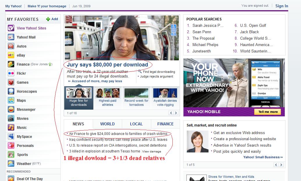 Trouvée via Twitter, cette image qui vaut mieux que mille mots. Condamnée à payer près de 2 millions de dollars pour avoir téléchargé et partagé 24 chansons sur Kazaa, Jammie Thomas va devoir indemniser l’industrie du disque à hauteur de 80.000 dollars par chanson. Sur la même page de Yahoo Actualités, l’internaute apprend qu’Air France versera 24.000 dollars de dédommagement aux victimes endeuillées par le crash du vol AF 447.