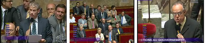 Le remerciant « de votre brillante intervention de ce matin« , il a demandé au ministre s’il pouvait expliquer l’intérêt de son projet de loi alors que les lobbys culturels « s’exaspèrent de l’obstruction stérile » à laquelle se livrent les députés socialistes, qui ont déposé plus de 800 amendements sur le texte. Comme le veut l’exercice, le député était entouré de députés UMP censés montrer aux caméras la solidarité de toute la majorité avec la question du rapporteur.