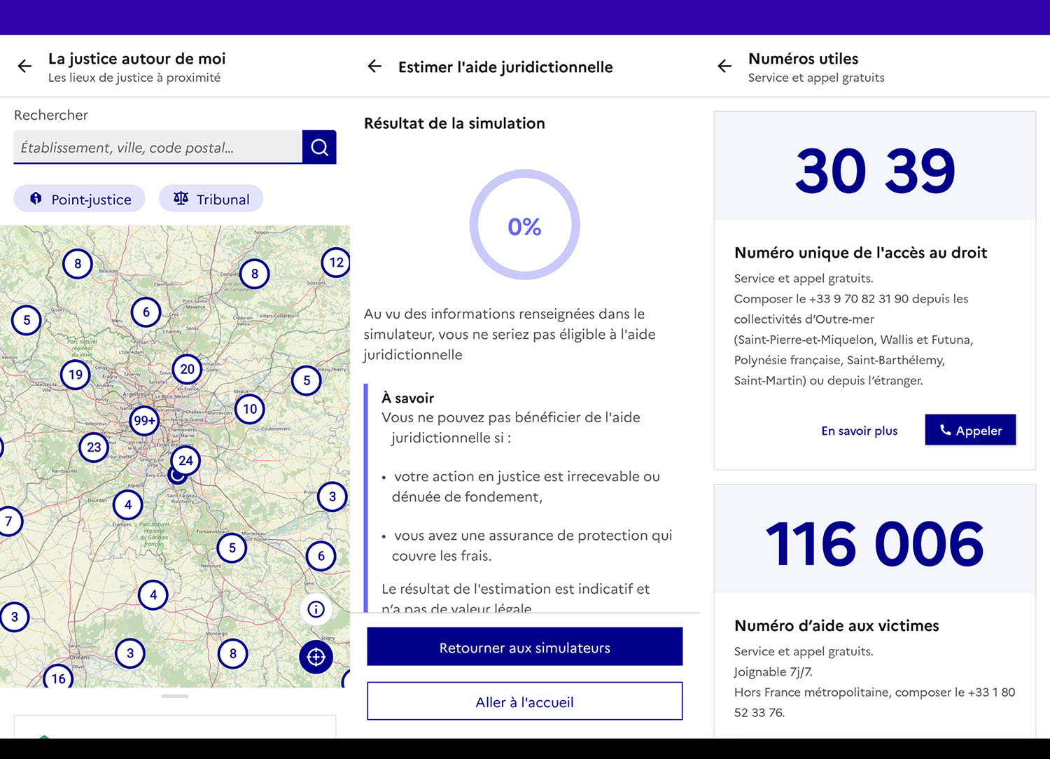 Chaque rubrique dispose de fonctionnalités particulières. La carte servant à trouver tribunaux ou des lieux d’accueil pour bénéficier d’une assistance inclut ainsi un outil de géolocalisation automatique, selon l’emplacement de votre smartphone. Il y a aussi un champ de recherche et des filtres selon le type d’établissement désiré.