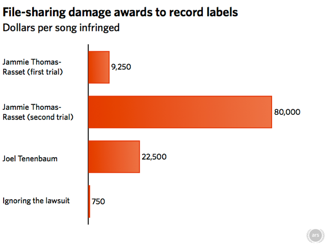 Nancy Gartner, après avoir accepté les revendications des industries du disque, aurait ainsi pu fixer des peines importantes contre ces prétendus pirates. D’autant que les différents lobbys cherchent à faire un maximum d’exemples pour dissuader les internautes de télécharger illégalement sur Internet… à moins qu’ils ne souhaitent se frotter à l’appareil judiciaire américain. Sauf que la juge a concédé qu’un minimum légal de dommages et intérêts : 750 dollars par titre. Accusés d’avoir téléchargé en moyenne dix morceaux, relevant l’amende à 7 500 dollars par individu, sans parler des frais de justice s’élevant à quelques centaines de dollars.