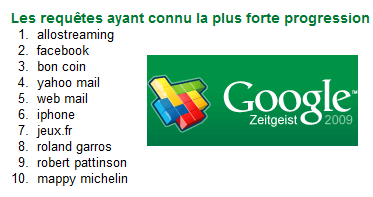 La loi Hadopi devait servir de mesure éducative pour apprendre aux internautes à se détourner du peer-to-peer au profit de plateformes légales, rémunératrices pour la création. Pour le moment, c’est raté, et en beauté. Google a en effet publié son traditionnel classement Zeitgeist des requêtes les plus populaires pour l’année 2009, et en France c’est le terme « Allostreaming » qui arrive en tête des requêtes qui ont connu la plus forte progression, devant « Facebook » !