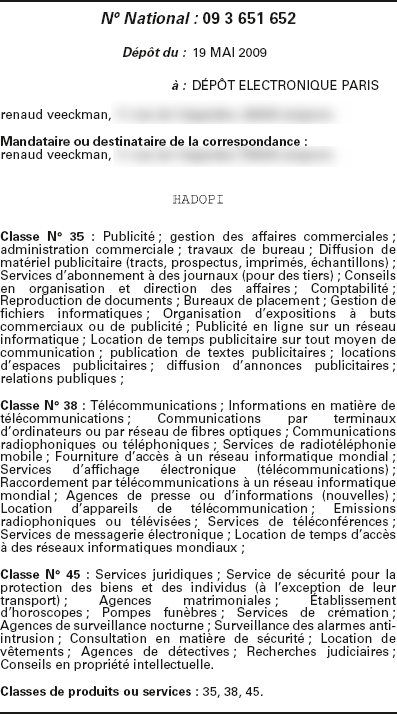L’affaire aurait pu s’arrêter là si un certain Renaud Veeckman n’avait pas déposé la marque le 16 mai 2009 à l’Institut National de la Propriété Intellectuelle, six mois avant le ministère de la Culture et de la Communication (16 novembre 2009). Interrogé par l’AFP, le particulier avait récupéré cette marque pour monter une plate-forme de téléchargement sous ce nom, reconnaissant le côté « impertinent » et « second degré » de sa démarche.