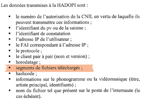 En effet, il est précisé sur les autorisations de la CNIL délivrées aux sociétés d’ayants droit et révélées par PC Inpact que parmi les « données transmises à la Hadopi » figurent impérativement des « segments de fichiers téléchargés« , avec les traditionnels adresses IP, protocole P2P utilisé, client P2P, date et heure du constat, etc.