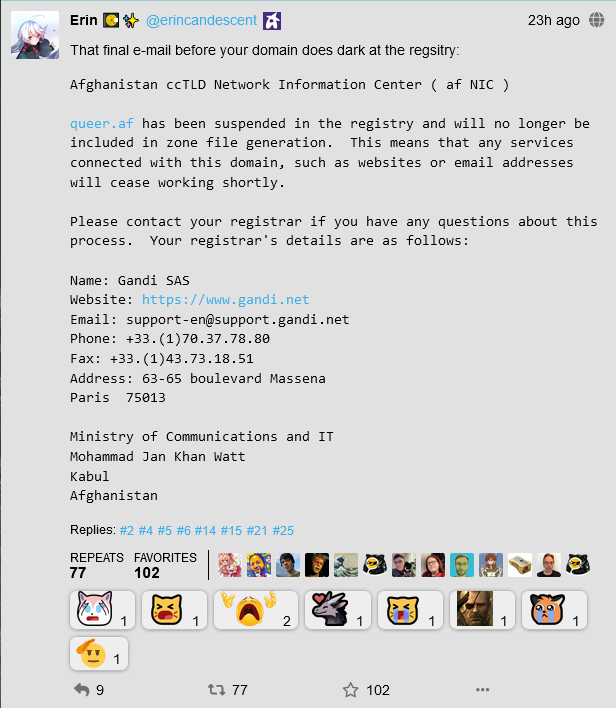 Erin Shepherd, qui administrait le site, a partagé sur son espace personnel le 12 février le contenu d’un mail indiquant la suspension du domaine. Il y est dit que « queer.af a été suspendu » et « que tous les services liés à ce domaine, tels que les sites web ou les adresses électroniques, cesseront de fonctionner sous peu ».