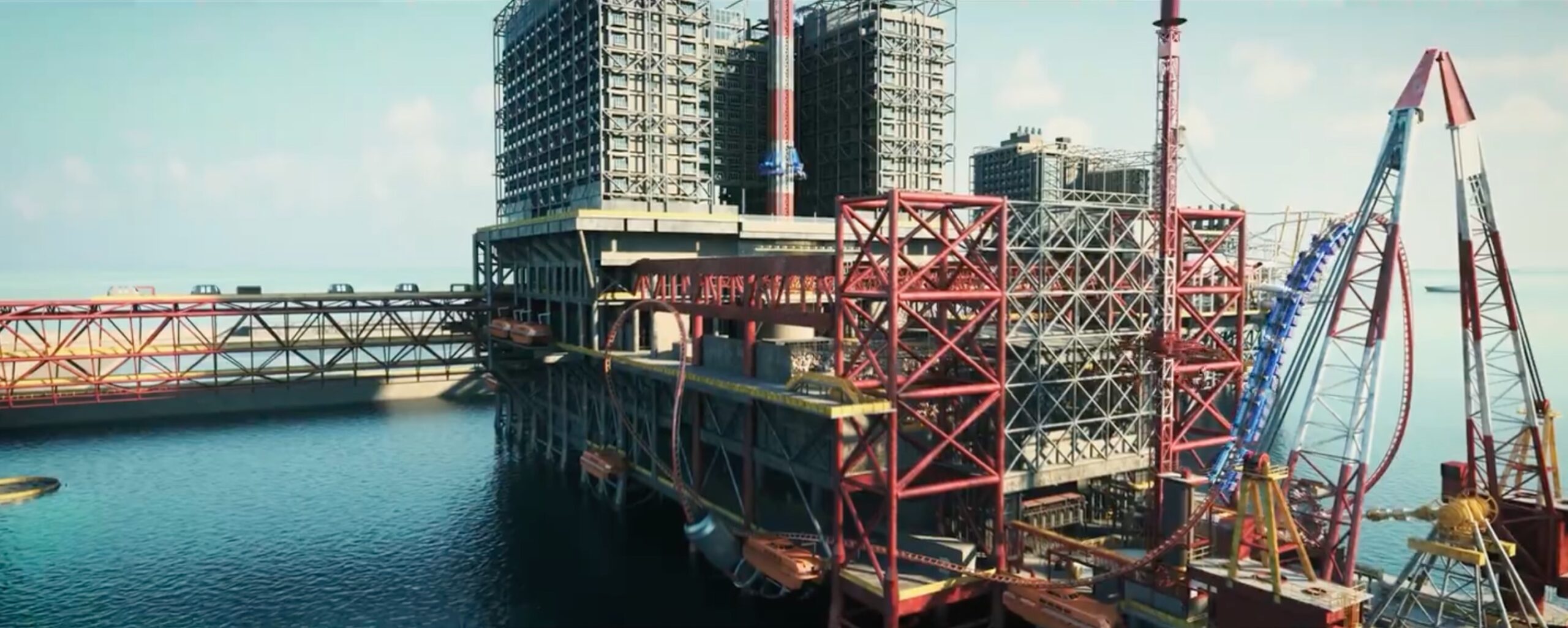 - The Derrick, la plus grande plateforme, qui aura 4 restaurants, une salle de spectacle pouvant accueillir jusqu’à 6 000 personnes, un parc d’attraction avec des rollers coasters, un hôtel 5 étoiles, un centre pour les enfants et un restaurant suspendu.