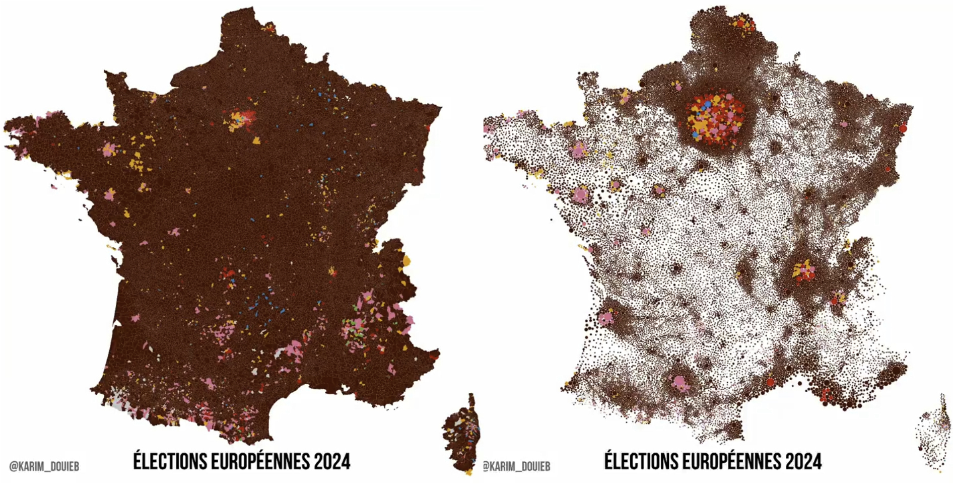 On observe que la carte de France reste très majoritairement marron : c’est normal, vu combien le Rassemblement national a eu du succès lors de ces élections du 9 juin. Elle permet néanmoins de mieux se rendre compte du nombre de votants pour chaque parti, en fonction de la taille du territoire. Par exemple, il est trompeur de mettre sur le même plan une zone de 105 km carrés de superficie très peuplée (comme Paris et ses 2,1 millions d’habitants) et une très dépeuplée (comme la commune de Meyrueis en Lozère, et ses 704 habitants répartis sur 104 km carrés).