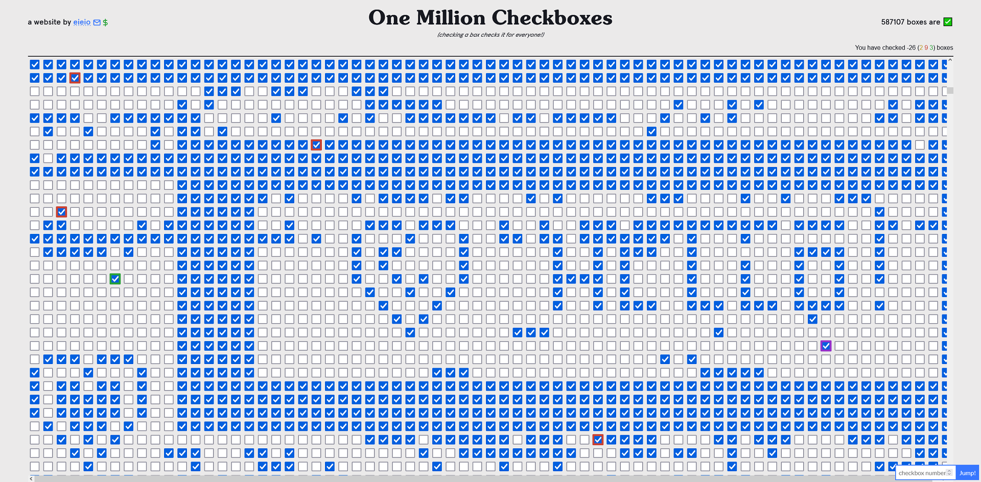 C’est ce week-end que s’ouvre la « trêve » politique : jusqu’au moment où les résultats seront annoncés, la propagande électorale est censée s’arrêter. En attendant de connaître l’issue du premier tour des élections législatives, il y a toujours la possibilité de patienter sur One Million Checkboxes, un petit jeu qui est apparu la semaine passée.