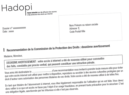 L’Hadopi nous a transmis le courrier-type que recevront les abonnés à Internet sous forme de courrier recommandé lorsqu’ils ont déjà été avertis par le passé par e-mail, mais que leur adresse IP a été de nouveau collectée et transmise depuis moins de six mois. Vous pouvez télécharger le modèle en PDF : page 1, page 2.