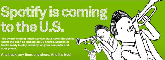Le service suédois, célébré en Europe, « va bientôt débarquer sur les rives américaines. Des millions de pistes musicales sont prêtes à être écoutes instantanément sur votre ordinateur ou sur votre téléphone« , annonce Spotify, qui cite de nombreux articles de presse (Time, Los Angeles Times, Wired, Billboard) et de multiples réactions (Mark Zuckerberg, Demi Moore) pour assoir sa réputation et sa renommée.