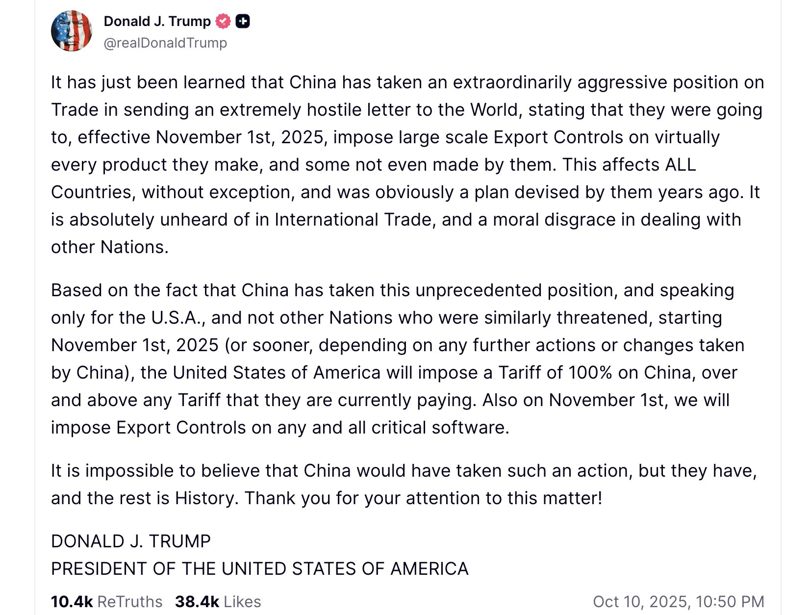 « Compte tenu de la position sans précédent adoptée par la Chine, et ne parlant qu’au nom des États-Unis, et non au nom d’autres nations qui ont été menacées de la même manière, à compter du 1er novembre 2025 (ou plus tôt, en fonction des mesures ou changements supplémentaires pris par la Chine), les États-Unis d’Amérique imposeront un droit de douane de 100 % à la Chine, en plus des droits de douane qu’elle paie actuellement. Le 1er novembre également, nous imposerons des contrôles à l’exportation sur tous les logiciels critiques ».