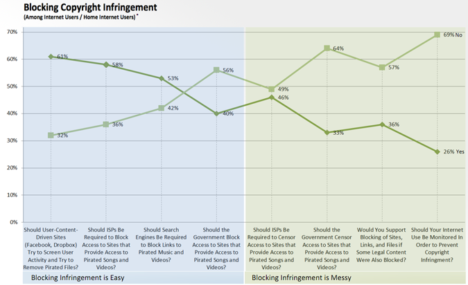 53 % des internautes américains sont favorables au fait que les moteurs de recherche bloquent les liens vers les contenus piratés, et 61 % estiment que les réseaux sociaux et les services d’hébergement de fichiers devraient « essayer de vérifier tous les contenus et de rejeter la musique et les films piratés ». 36 % continuent de soutenir le même blocage des contenus illicites même lorsqu’on leur dit qu’il entraîne un blocage de contenus licites.