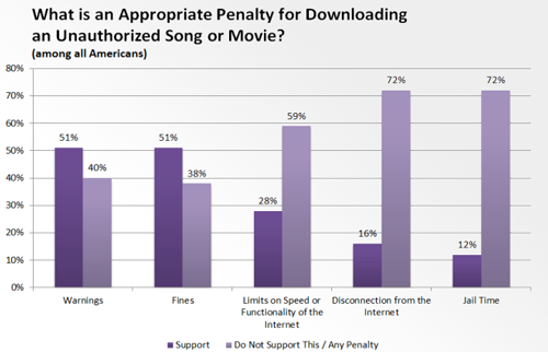 Parmi ceux qui souhaitent des représailles, 87 % soutiennent le principe d’une amende. Une minorité (47 %) se dit favorable à des mesures de bridage de l’accès à Internet, et 26 % trouvent acceptable une suspension de l’accès à Internet. 86 % sont favorables à des avertissements. Mais dans l’ensemble des sondés, 51 % seulement sont favorables aux avertissements et amendes, et 16 % à la suspension de l’accès à Internet.