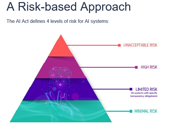Avec l’AI Act, l’Europe a choisi de réguler l’IA selon une échelle de risques comptant quatre niveaux : risque minimal, risque limité, risque élevé et risque inacceptable. Cette dernière catégorie est interdite dans l’Union. On trouve par exemple la police prédictive, la notation sociale, la duperie par IA et cinq autres pratiques.