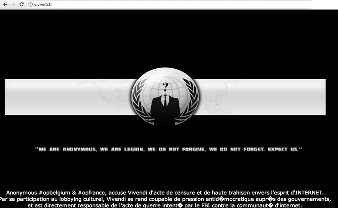 Du côté de Vivendi, c’est une tentative réussie de « defaçage » qui a provoqué la fermeture du site. Pendant quelques minutes, le site de la maison-mère d’Universal Music, Canal+, Activision ou encore SFR affichait un logo d’Anonymous, accompagné d’un texte revendicatif. « Anonymous accuse Vivendi d’actes de censure et de haute trahison envers l’esprit d’Internet. Par sa participation au lobbying culturel, Vivendi se rend coupable de pression anti-démocratique auprès des gouvernements, et est directement responsable de l’acte de guerre intenté par le FBI contre la communauté d’Internet« , disait le message :