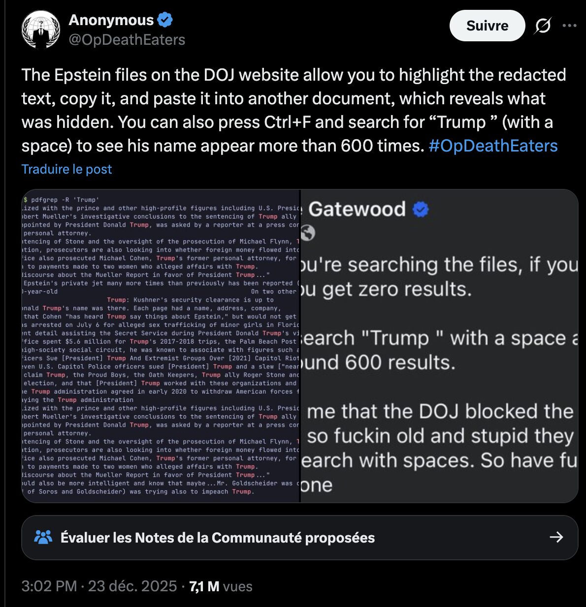 Mais Internet est parfois plein d’ironie. Le groupe Anonymous (#OpDeathEaters), très actif et anti-Trump sur les réseaux sociaux, s’est rendu compte que le DOJ avait commis l’erreur la plus basique en matière d’édition de documents numériques : il est possible de copier-coller certains rectangles dans les 30 000 documents publiés le 23 décembre 2025.