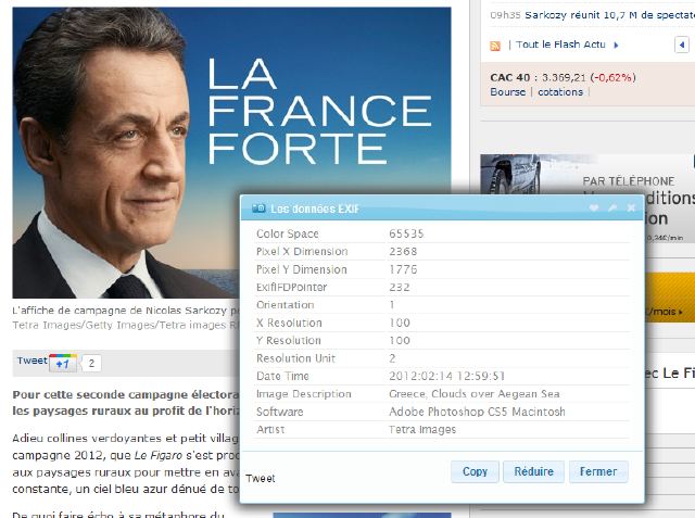 La découverte a été permise par la diffusion du fichier numérique de l’affiche, qui révèle les données EXIF du fichier. On voit que la description de l’image de fond n’a pas été changée, et qu’il s’agit d’une photo de la banque d’images Tetra Images intitulée « Greece, Clouds over Aegean See ». On la retrouve effectivement sur le site de l’agence: