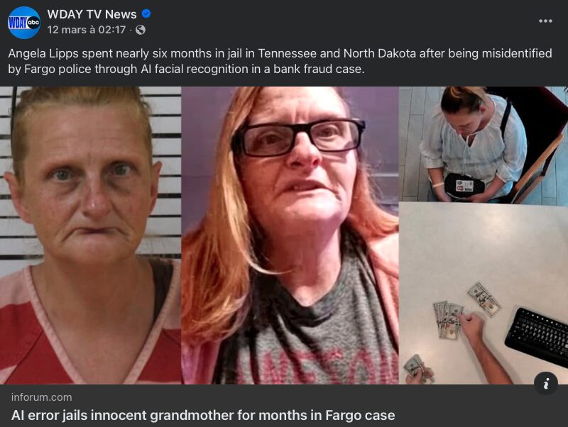 L’erreur d’un système de reconnaissance faciale combinée à de graves défaillances policières a conduit une innocente en prison. À Fargo, ville du Dakota du Nord aux États-Unis, Angela Lipps, 50 ans, a été identifiée à tort comme suspecte dans une affaire de fraude bancaire par un outil d’intelligence artificielle. Prise pour une autre, la grand-mère de cinq petits-enfants a passé près de six mois en détention, de juillet à décembre 2025, a révélé le 11 mars 2026 la chaîne télé locale du Dakota du Nord WDay.
