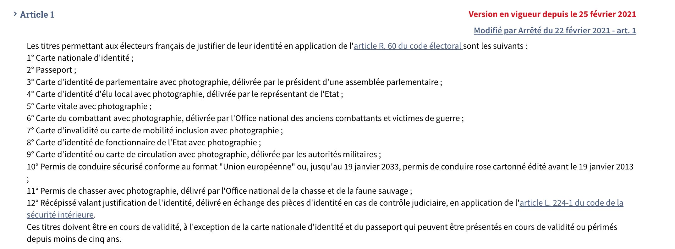 Le cadre juridique du vote en France est régi par le Code électoral, et plus précisément par l’Article R 60. Ce dernier énoncé que dans les communes de 1 000 habitants et plus, l’électeur doit présenter un titre d’identité. La dernière révision de cette liste date de février 2021 :