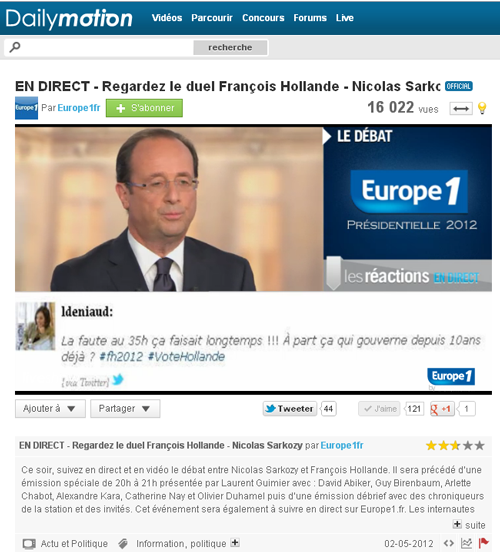 De son côté, Europe 1 avait inauguré avec le débat présidentiel un nouveau service, qui enrichissait la vidéo diffusée sur Dailymotion d’une sélection de tweets réalisée par un journaliste de la rédaction. L’objectif était ainsi de faire sentir l’ambiance autour du débat chez les internautes-spectateurs, et de réaliser du « fact-checking » en direct, avec l’aide des utilisateurs de Twitter :