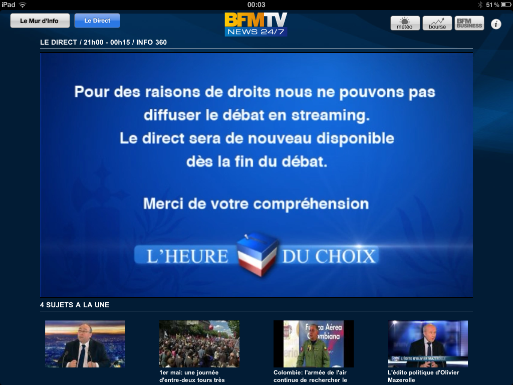 « Pour des raisons de droits, nous sommes contraints de stopper la diffusion du débat en vidéo« . C’est le message que des milliers d’internautes ont vu soudainement apparaître mercredi soir entre deux phrases de François Hollande et Nicolas Sarkozy, alors qu’ils regardaient le débat présidentiel sur la chaîne Dailymotion du site d’Europe 1.