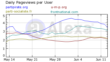 En effet, si l’on regarde l’audience des sites internet des principales formations politiques, telle qu’évaluée par Alexa, il apparaît que le site officiel du Parti Pirate est celui qui a eu la plus forte audience pendant la campagne électorale. En nombre de visiteurs, il a dépassé ceux du Front National, de l’UMP et du Parti Socialiste :