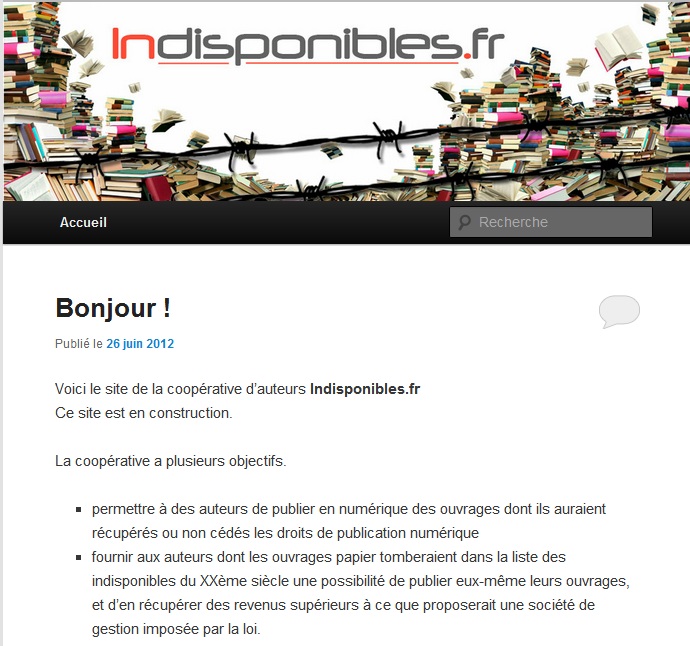 Et en parallèle, en France, les auteurs soucieux de s’opposer à la loi sur la numérisation des oeuvres indisponibles du XXe siècle, qui représente pour eux une violation du droit d’auteur, ont dégainé leur riposte : Indisponibles.fr